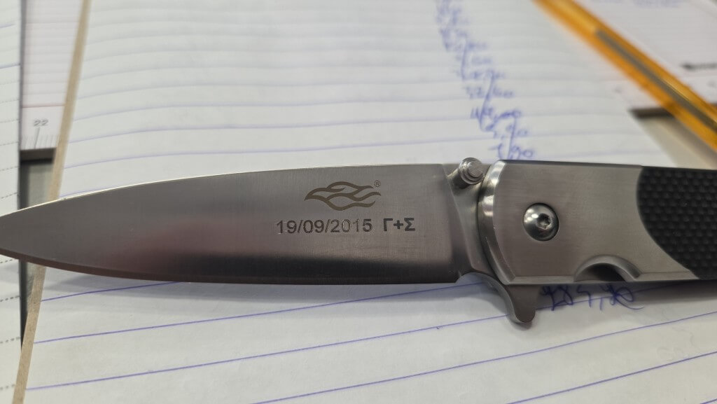 Με σύγχρονη τεχνολογία και προσοχή στη λεπτομέρεια, δημιουργούμε κομψά σχέδια, μονογράμματα, λογότυπα ή μηνύματα που αποτυπώνουν στιλ και χαρακτήρα. Κάθε χάραξη εκτελείται με ακρίβεια ώστε να αναδεικνύει τη λεπίδα χωρίς να επηρεάζει τη λειτουργικότητά της.