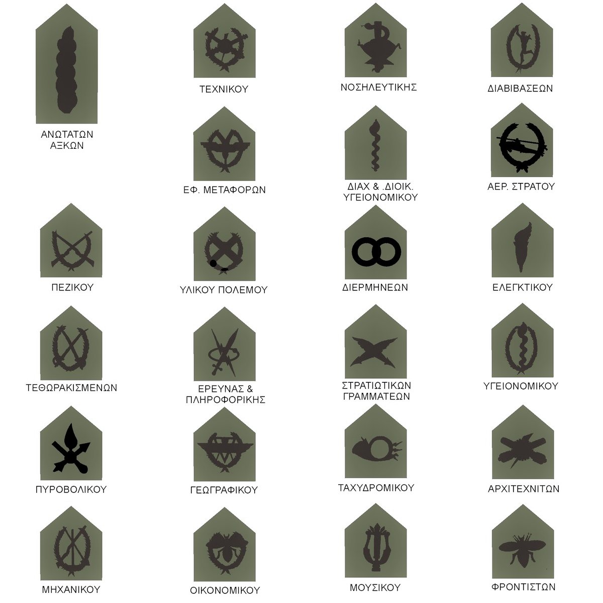 | ΟΠΛΑ-ΣΩΜΑΤΑ | ΠΕΖΙΚΟΥ, ΤΕΘΩΡΑΚΙΣΜΕΝΩΝ, ΠΥΡΟΒΟΛΙΚΟΥ, ΜΗΧΑΝΙΚΟΥ, ΔΙΑΒΙΒΑΣΕΩΝ, ΑΕΡ. ΣΤΡΑΤΟΥ, ΤΕΧΝΙΚΟΥ, ΕΦ. ΜΕΤΑΦΟΡΩΝ, ΥΛΙΚΟΥ ΠΟΛΕΜΟΥ, ΕΡΕΥΝΑΣ & ΠΛΗΡΟΦΟΡΙΚΗΣ, ΓΕΩΓΡΑΦΙΚΟΥ, ΟΙΚΟΝΟΜΙΚΟΥ, ΕΛΕΓΚΤΙΚΟΥ, ΥΓΕΙΟΝΟΜΙΚΟΥ, ΝΟΣΗΛΕΥΤΙΚΗΣ, ΔΙΑΧ. & ΔΙΟΙΚ. ΥΓΕΙΟΝΟΜΙΚΟΥ, ΔΙΕΡΜΗΝΕΩΝ, ΣΤΡΑΤΙΩΤΙΚΩΝ ΓΡΑΜΜΑΤΕΩΝ, ΤΑΧΥΔΡΟΜΙΚΟΥ, ΜΟΥΣΙΚΟΥ, ΑΡΧΙΤΕΧΝΙΤΩΝ, ΦΡΟΝΤΙΣΤΩΝ, ΚΑΤΑΔΡΟΜΩΝ, ΠΕΖΟΝΑΥΤΩΝ, ΑΛΕΞΙΠΤΩΤΙΣΤΗ, ΚΑΤΑΔΡΟΜΕΑ, ΡΙΠΤΗ, ΒΑΤΡΑΧΑΝΘΡΩΠΟΥ, ΝΑΡΚΑΛΙΕΥΤΗ, ΑΥΤΟΔΥΤΗ |
