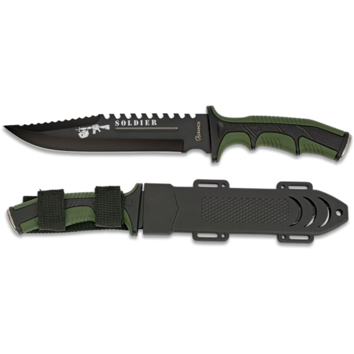 ΜΑΧΑΙΡΙ ALBAINOX 32405, Tactical Soldier, Green, 19cm Επιχειρησιακό μαχαίρι με οδόντωση στο επάνω μέρος της λάμας και θήκη από σκληρό πλαστικό .